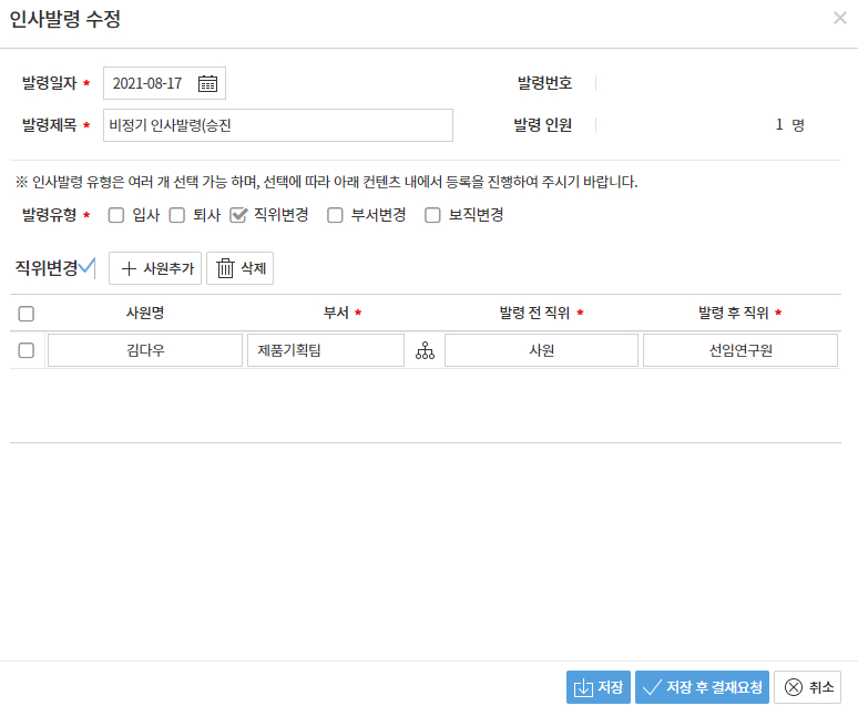 2. 발령하고자 하는 내용 등록 후 [저장]