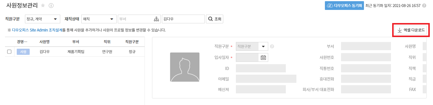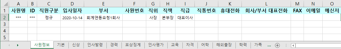2. 사원정보관리에 등록된 모든 직원의 인사정보가 엑셀 양식으로 다운로드