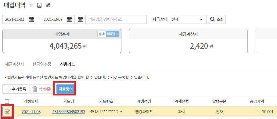 [매출입]>[매입관리]>[매입내역] 메뉴 '신용카드' 탭에서 조회된 신용카드 사용내역 중,