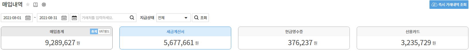 또한 매입내역 메뉴에서는 증빙자료별 매입대금을 바로 확인하실 수 있는 기능을 제공합니다.