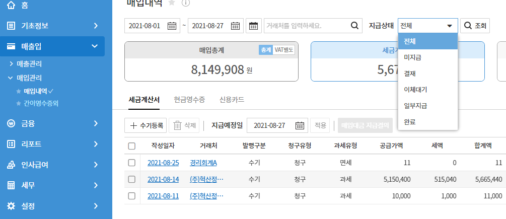 매입 세금계산서 발행 내역에 대한 지급 진행상태를 간편하게 조회하여 매입 미지급금 현황을 확인 하실 수 있습니다.