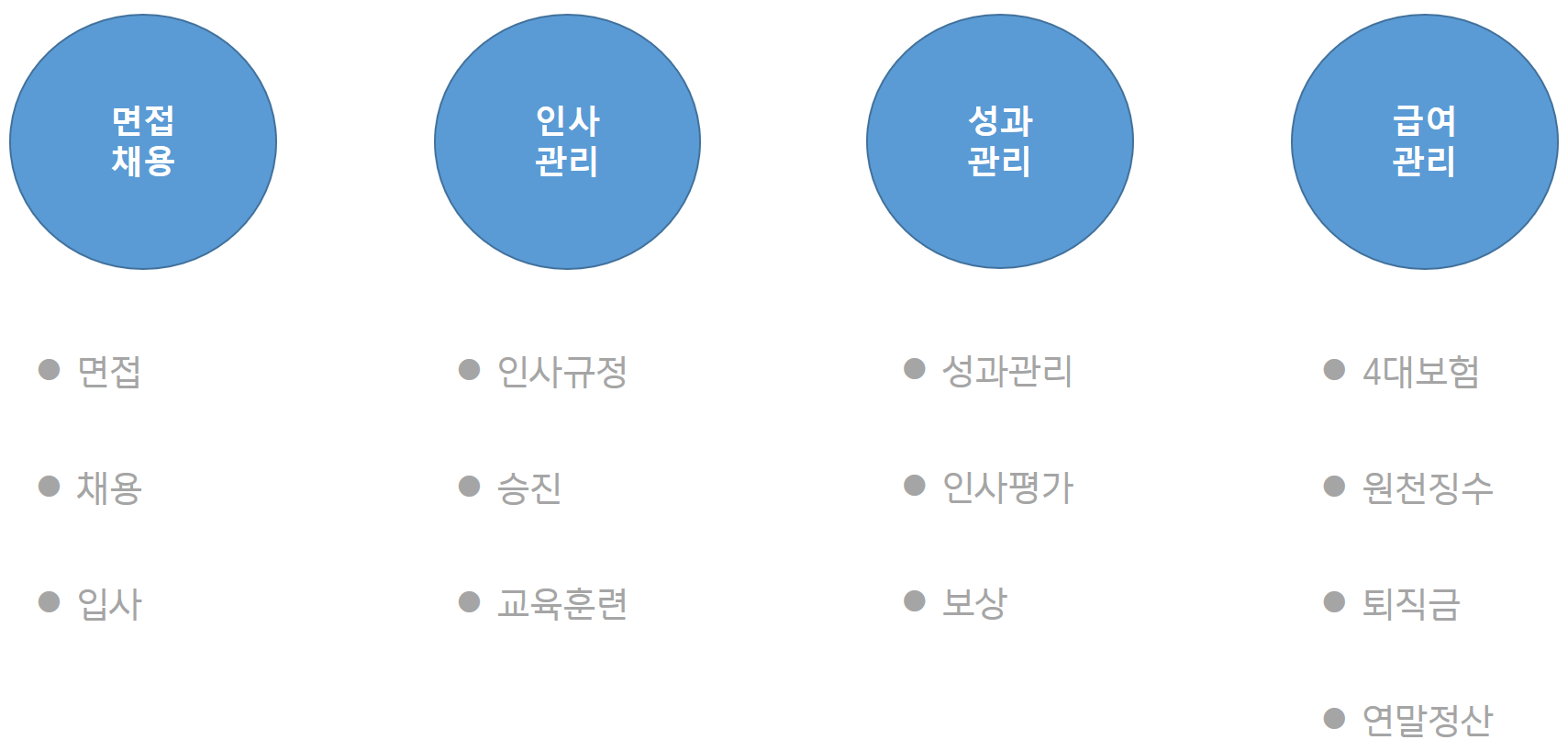 먼저, 인사담당자의 업무를 크게 정리해 보면 직원의 입사부터 퇴사, 직원들의 인사/급여/성과관리 등