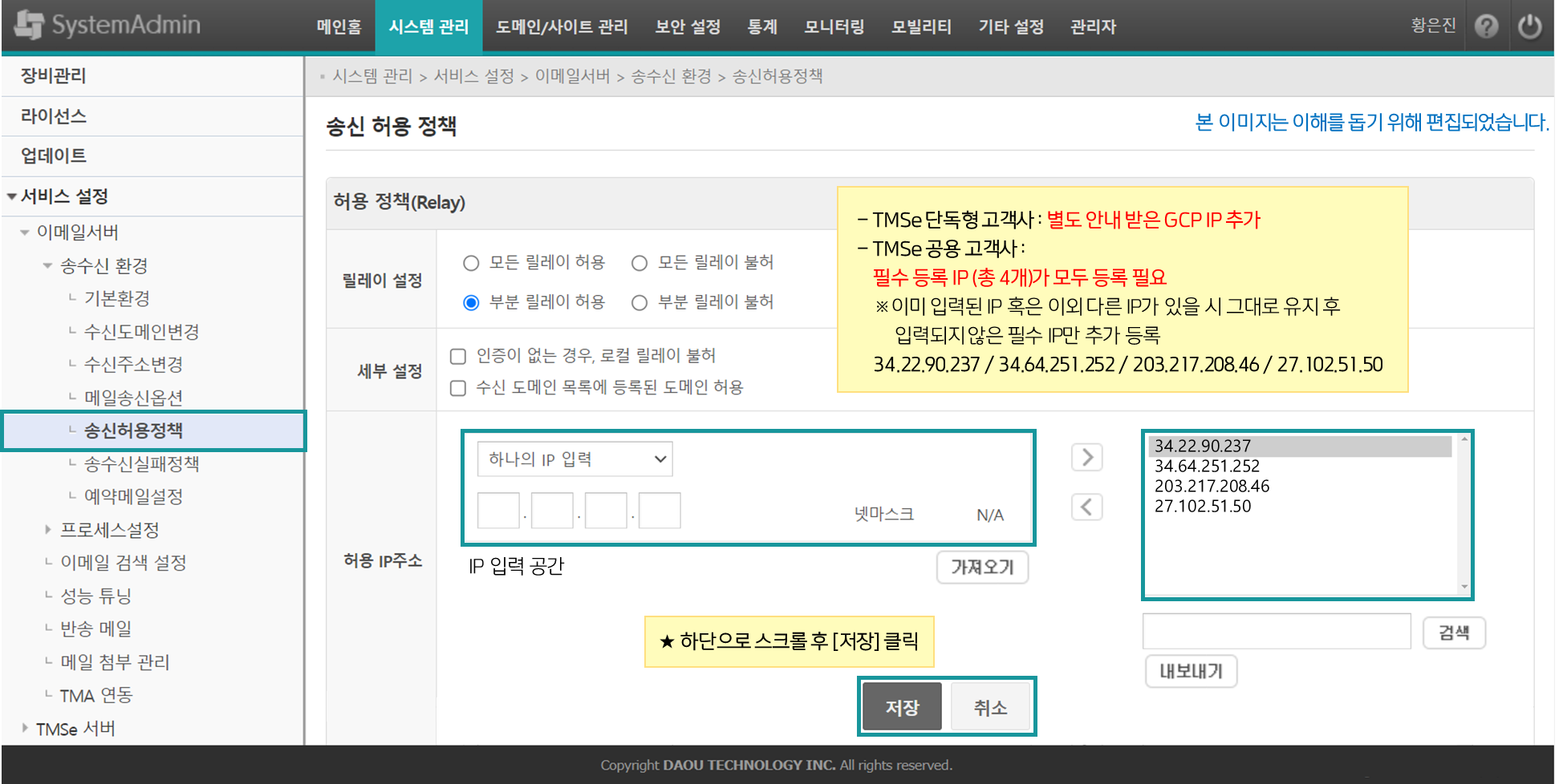 기존 IP는 그대로 유지하며, 별도 안내드린 GCP TMSe IP 추가 후 저장