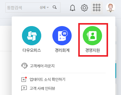 경영지원 서비스 접근권한이 있는 사용자는 전체 메뉴가 표시되고,