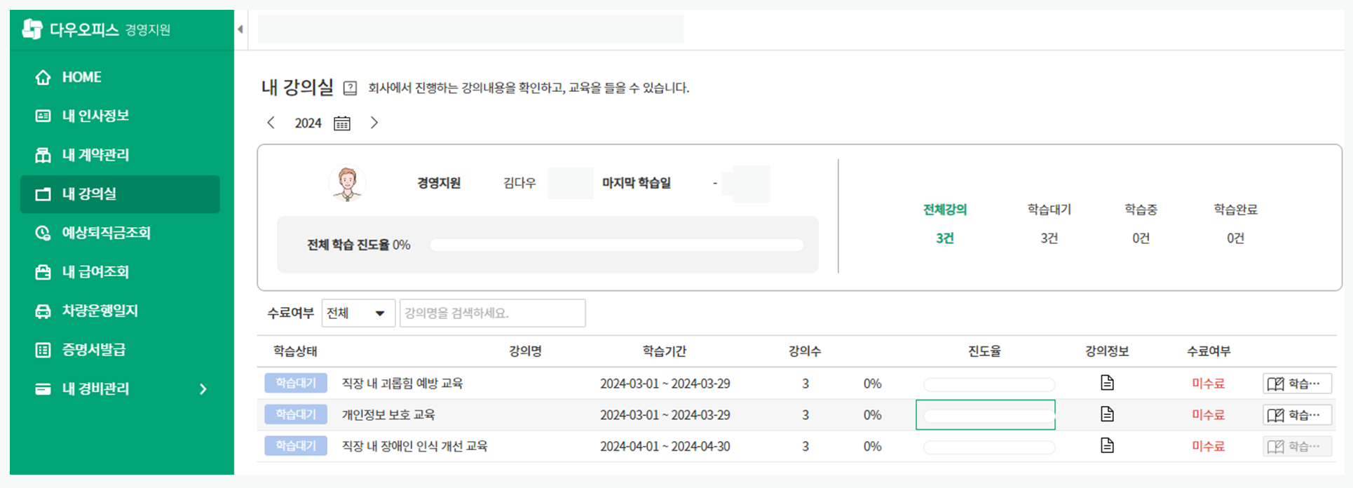 경영지원 접근권한이 없지만 법정의무교육 수강자로 지정된 사용자는 내 강의실 메뉴만 표시됩니다.