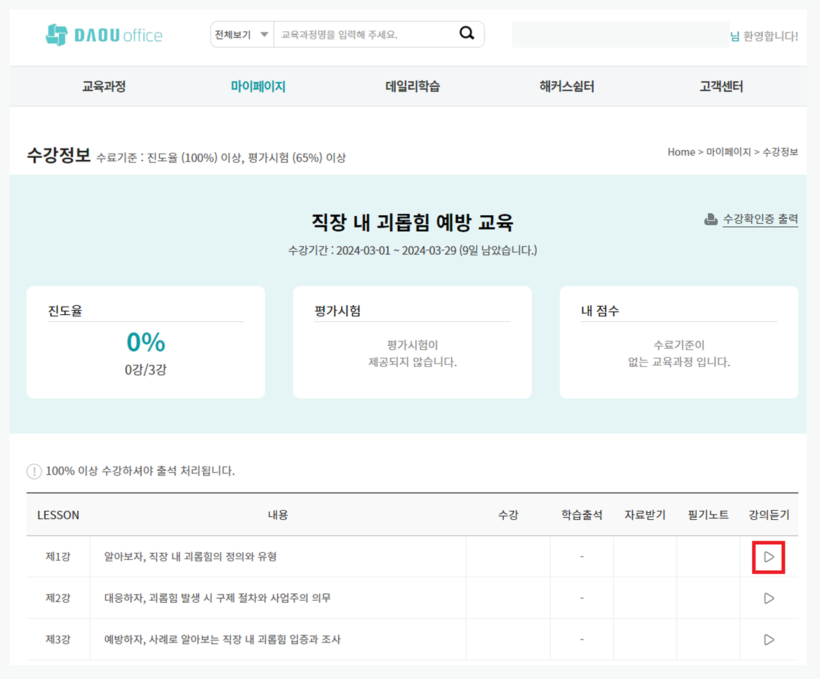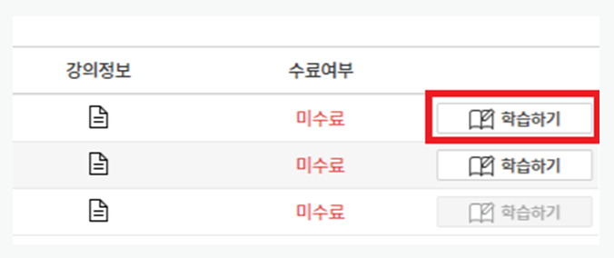 내 강의실 > 강의목록에서 [학습하기] 클릭시