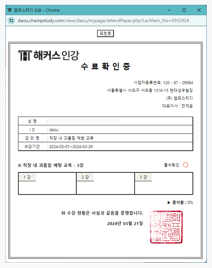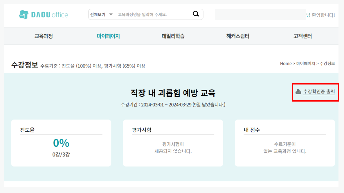 해커스HRD 강의실에서 [수강확인증 출력]을 클릭하시면 수강 완료하신 교육의 수료증 발급도 가능합니다.