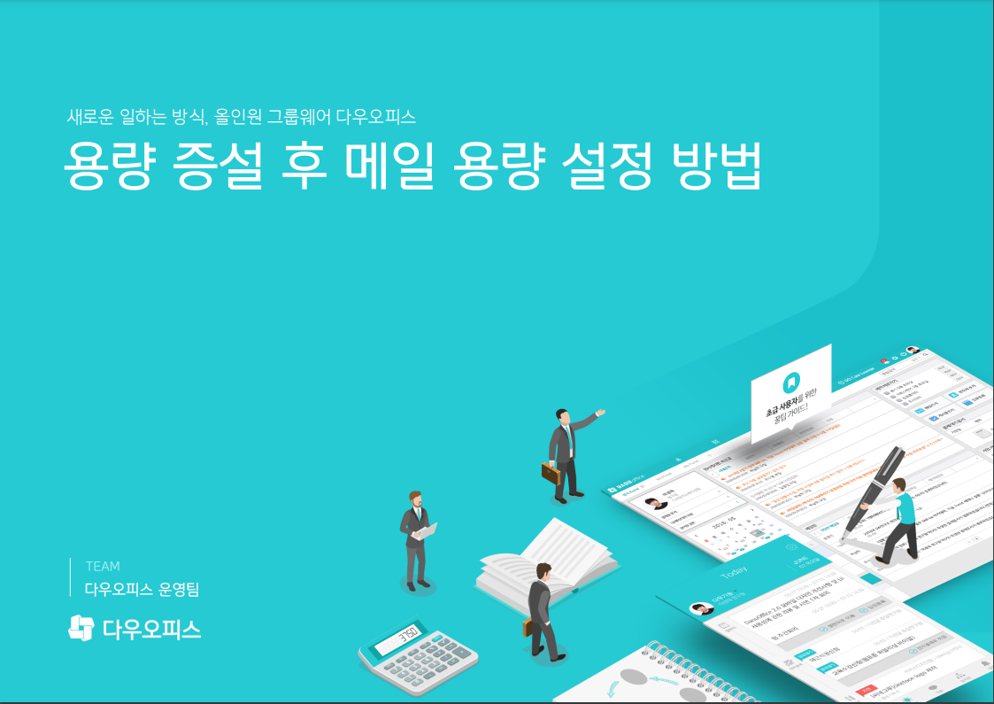 용량 증설 후 메일 용량을 추가하는 방법은 다음과 같습니다.1. 관리자페이지 > 메뉴 관리 > 메일 > 메일그룹에서 메일그룹별로 용량을 증설시킬 수 있습니다.2. 관리자페이지 > 조직관리 > 멤버통합관리에서 계정별로 메일함 용량을 추가할 수 있습니다.