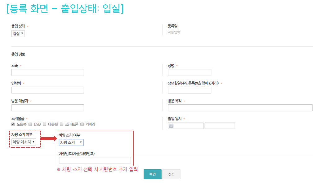 사내 외부 방문자 출입통제를 위해 방문 정보(방문 목적, 방문 대상자, 출입시간 등)에 대한 출입이력정보 관리