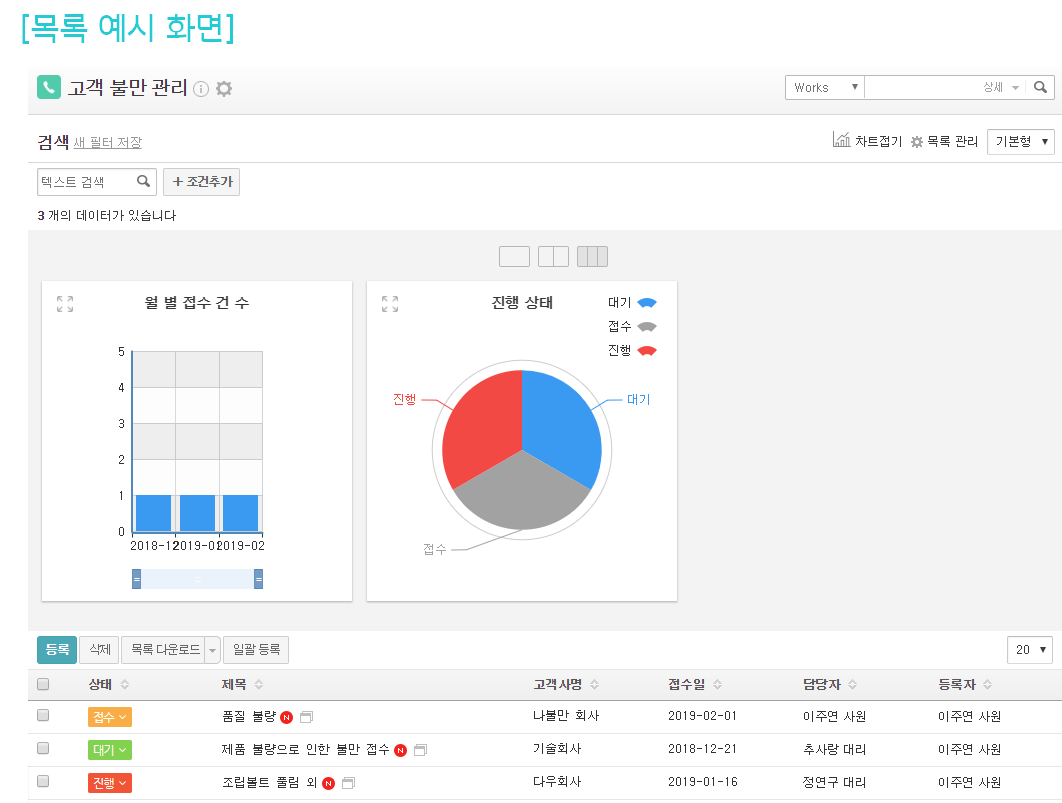 고객 불만 관리 앱 주요 화면은 아래와 같습니다.