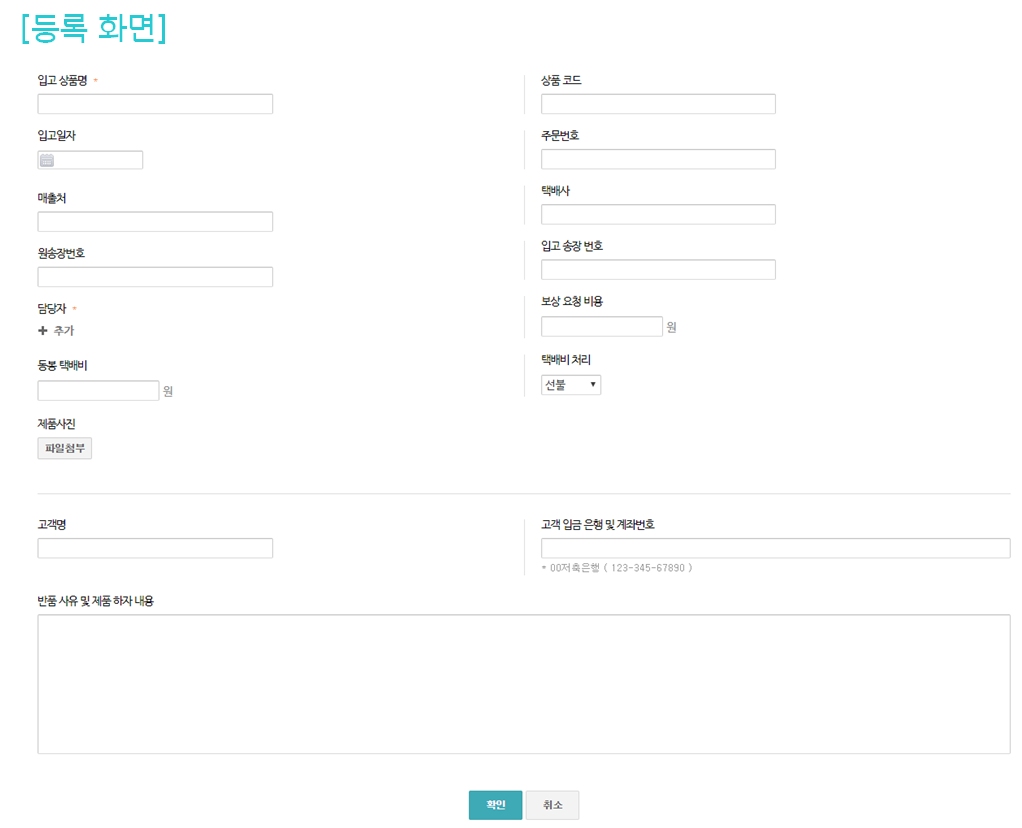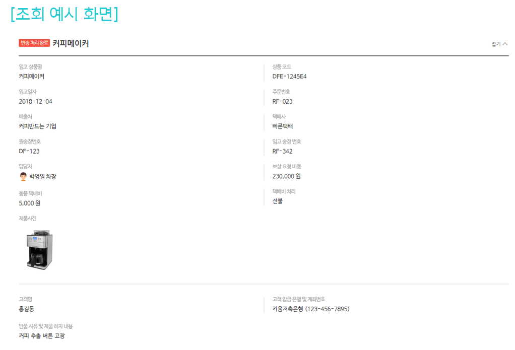 택배 반품을 위해 사내 담당자에게 요청하여 반품처리 정보 관리