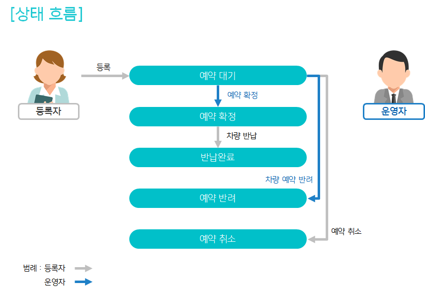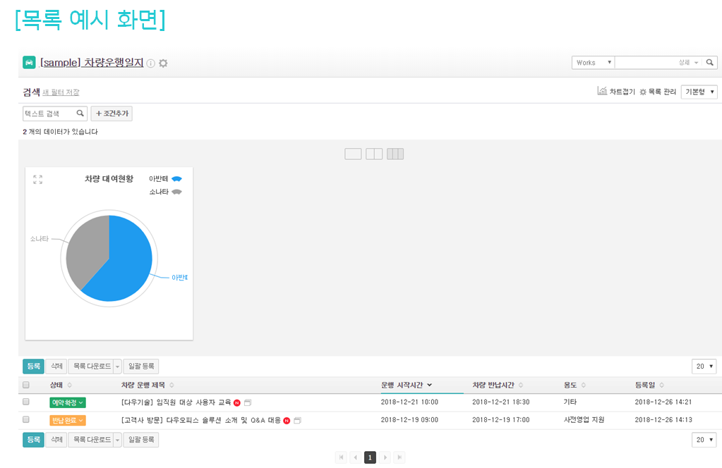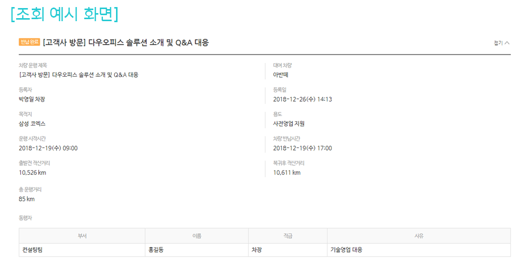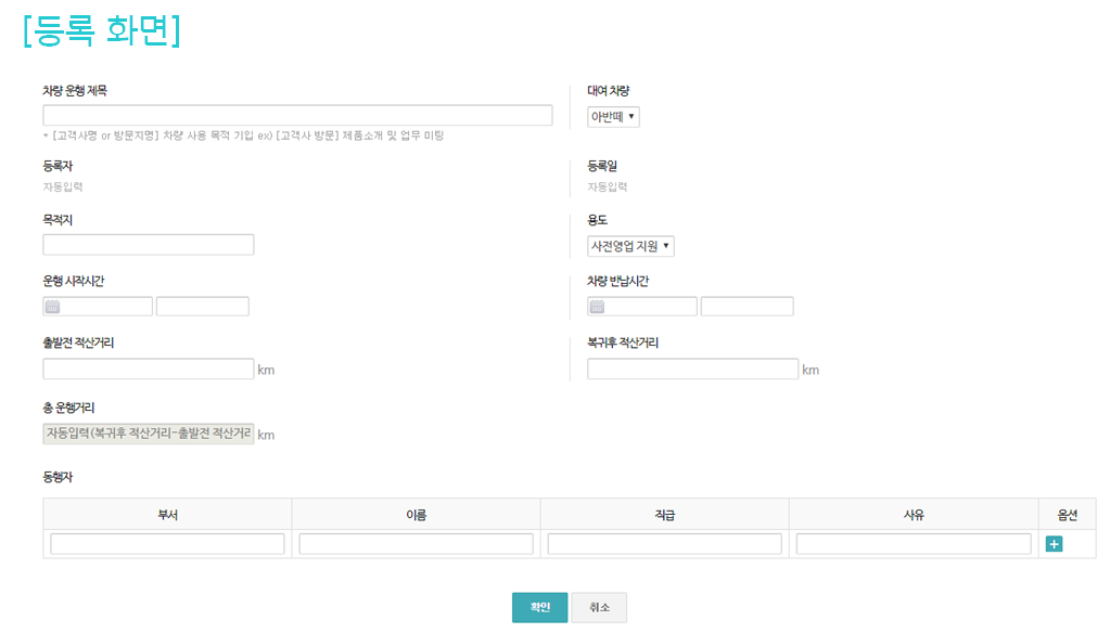 차량 운행 정보(차량 종류, 목적지, 운행 시작/반납 시간, 운행거리 등)를 기록하고 대여현황 조회