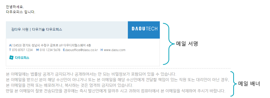 | 다우오피스에서 메일 서명과 메일 배너 적용 예시 |