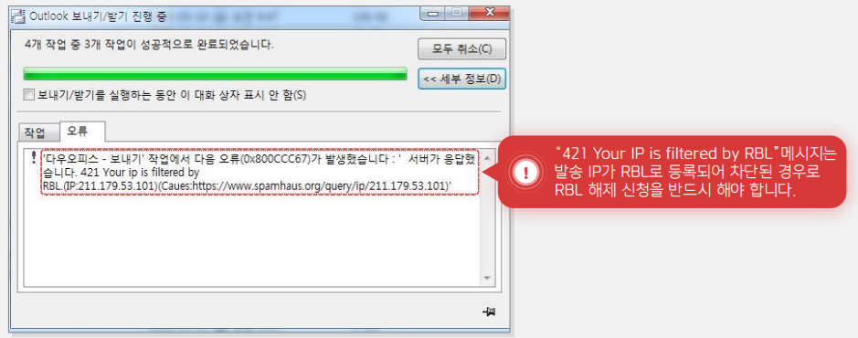 메일 서버 IP가 RBL에 등록된 경우 아웃룩에서 발생하는 오류 예시