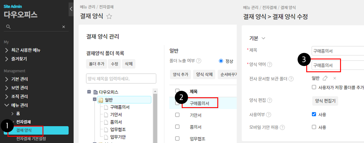 1. 관리자페이지 > 메뉴관리 > 전자결재 > 결재양식 클릭