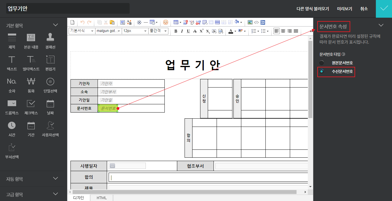 - 관리자가 문서번호 속성 설정을 통해 수신 문서번호로 설정이 가능합니다.