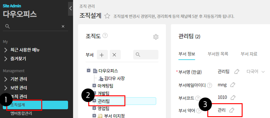 1. 관리자페이지 > 조직관리 > 조직설계 메뉴의 조직도에서 부서 선택