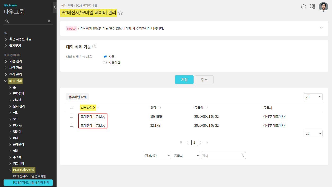 단, 메신저 상에서 첨부한 파일은 관리자페이지의 [PC메신저/모바일 데이터 관리]에서 확인할 수 있습니다.