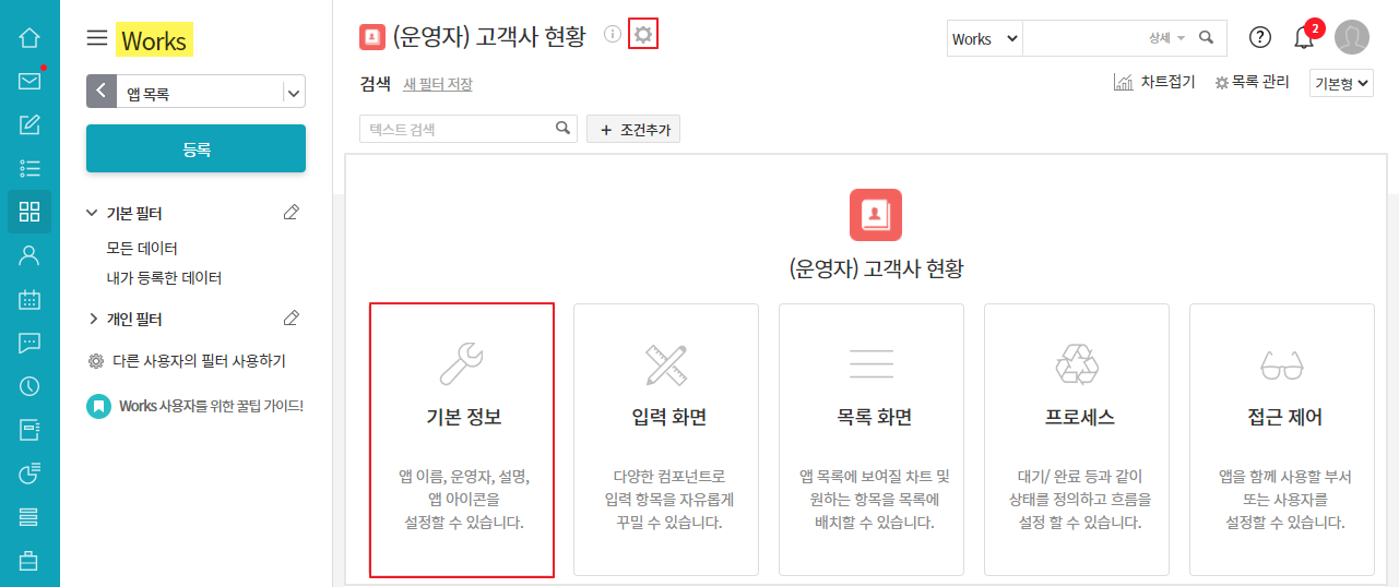 ① Works ▶ 앱명 옆 톱니바퀴 ▶ 기본 정보
