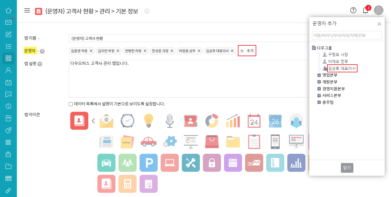 앱 클릭 ▷ 운영자 ▷ + 추가 ▷ 사용자 클릭 ▷ 저장