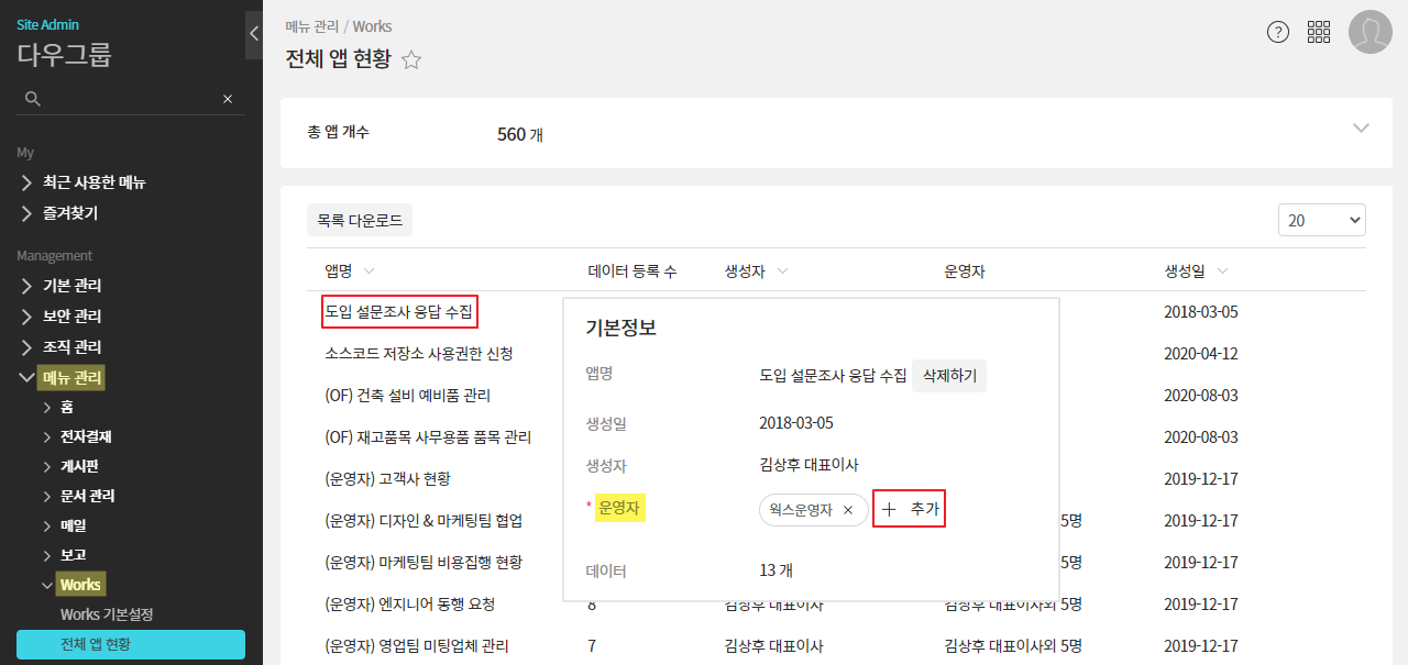 - 관리자페이지(SiteAdmin) ▶ 메뉴 관리 ▶ Works ▶ 전체 앱 현황 ▶