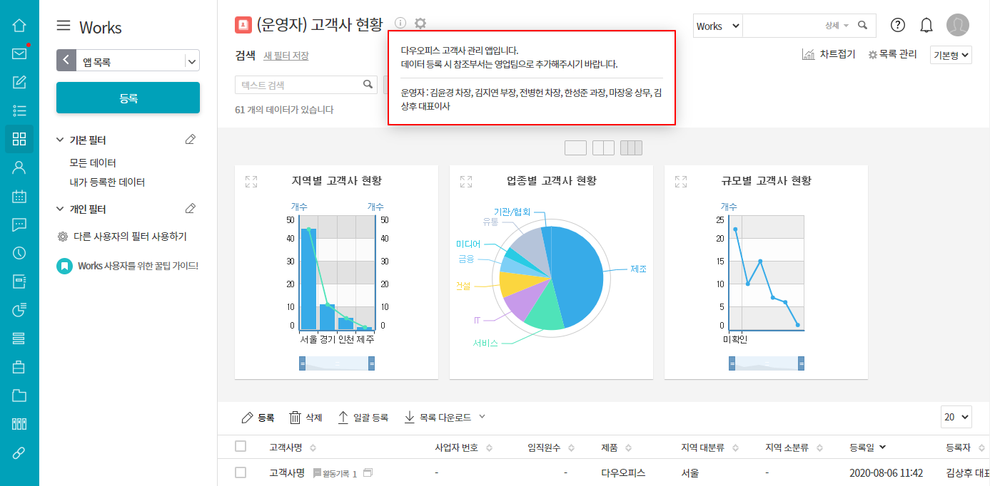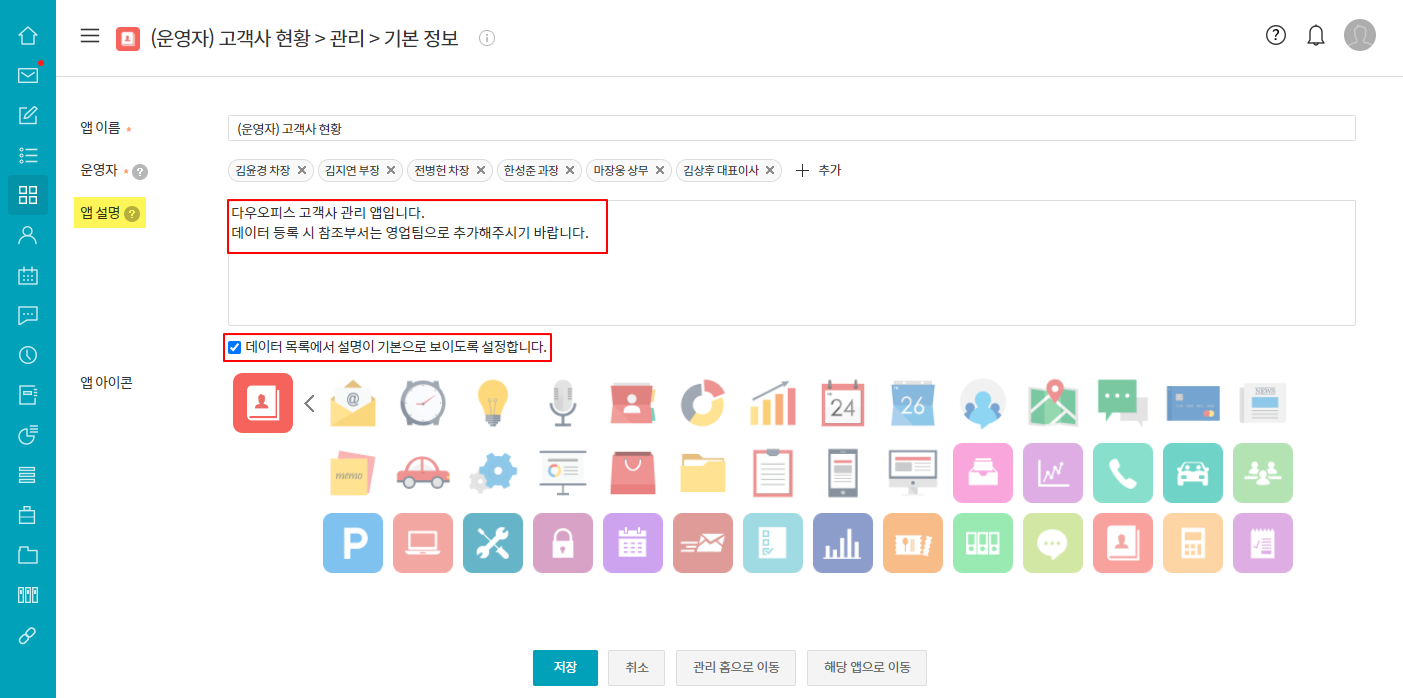 ② 앱 설명 ▷ 설명 입력 ▷ [데이터 목록에서 설명이 기본으로 보이도록 설정합니다.' 체크 ▷ 저장