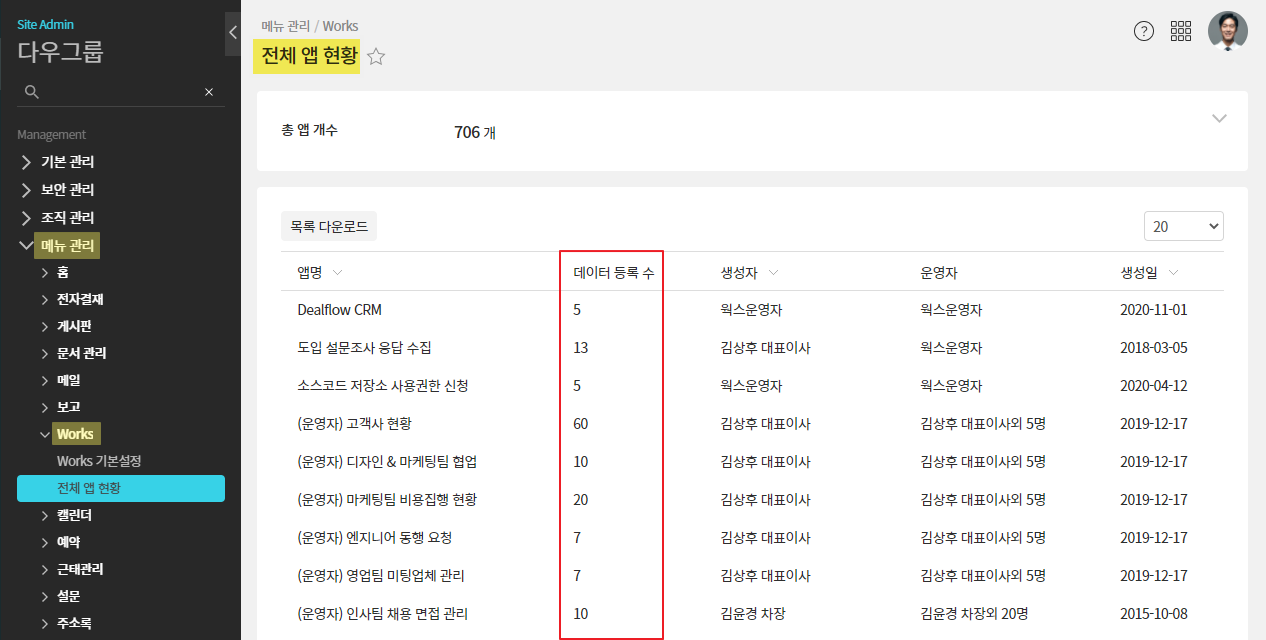 관리자페이지 (Site Admin) ▶ 메뉴관리 ▶ works ▶ 전체 앱 현황 ▷ 데이터 등록 수