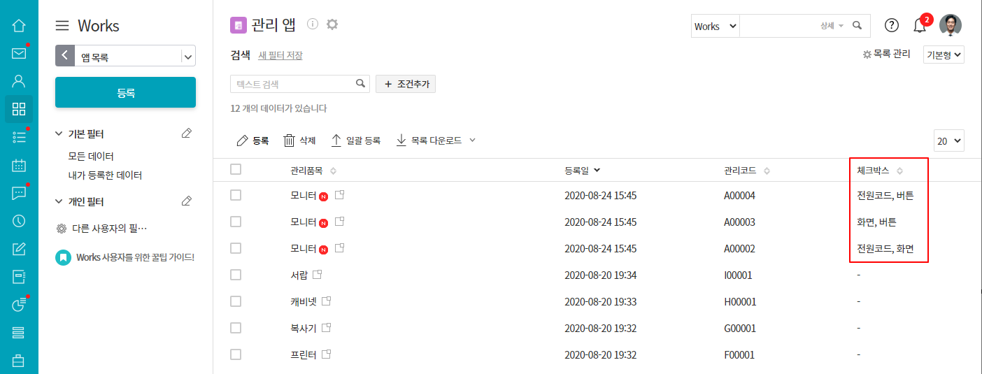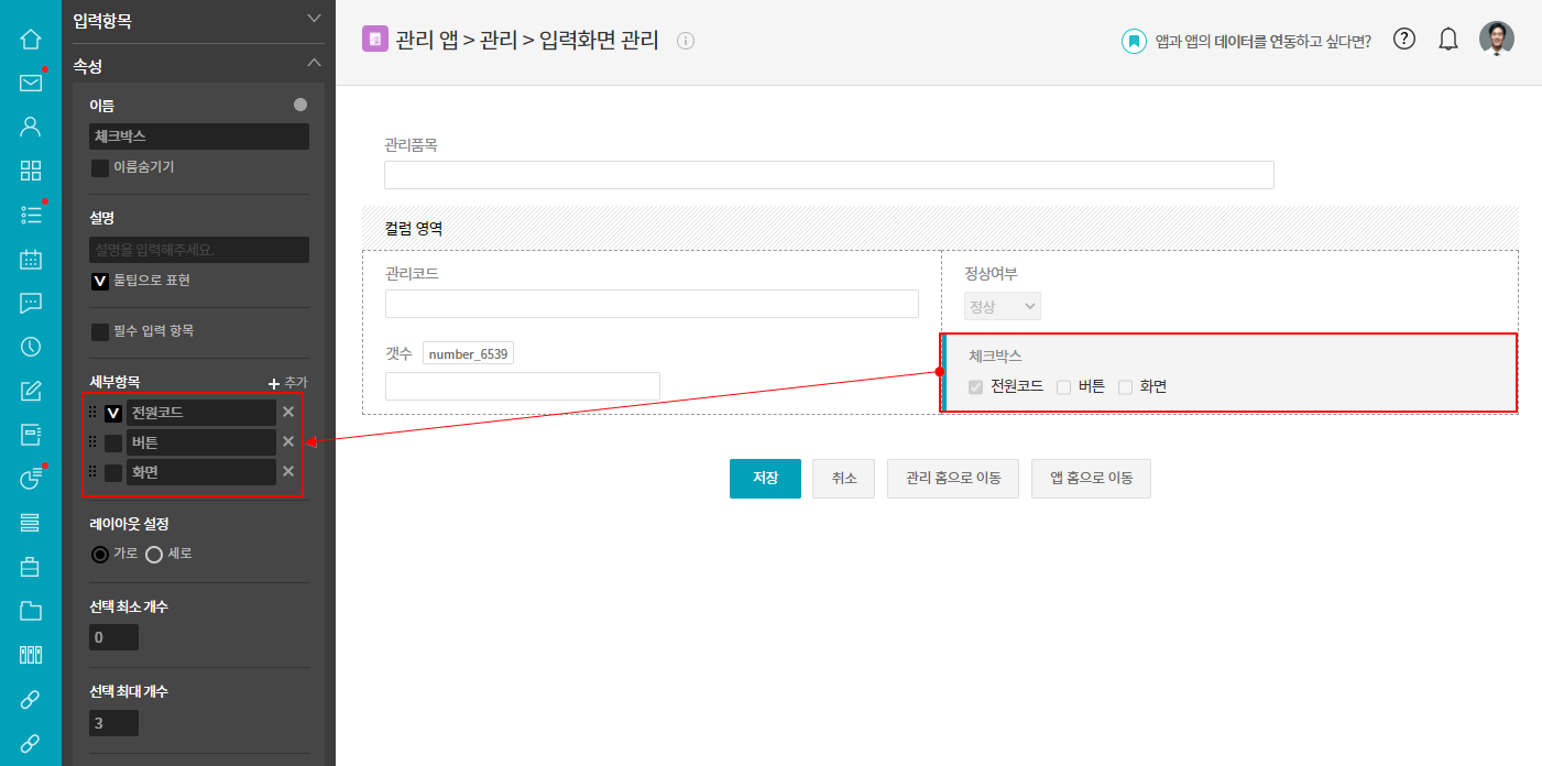 ※ 입력한 체크박스의 값은 앱 입력화면 관리에서 설정한 세부항목과 동일해야합니다.