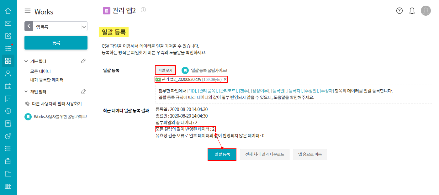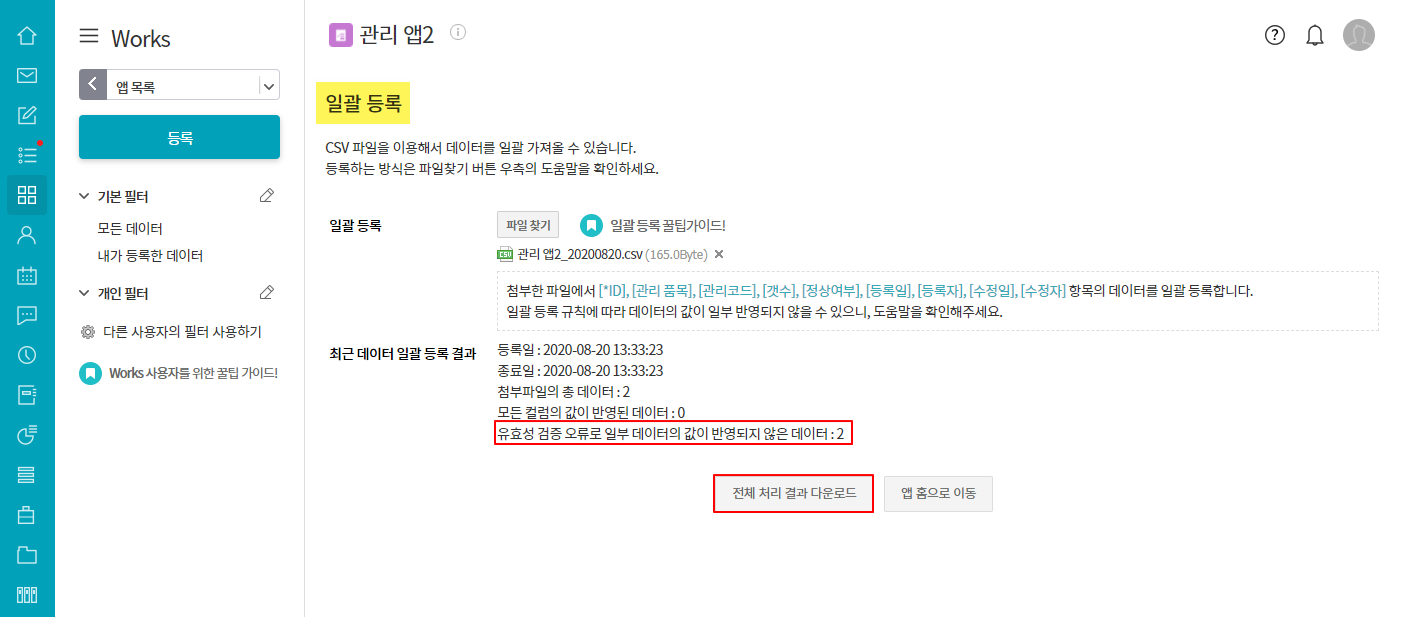 ① 일괄 등록 화면 ▷ 전체 처리 결과 다운로드