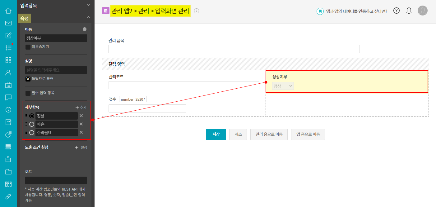 ④ 입력화면 관리 ▷ 정상여부 항목 선택 ▷ 속성 ▷ 세부항목 ▷ 설정된 옵션 값 확인