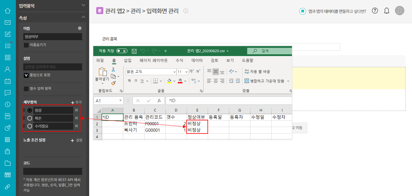⑤ 일괄 등록 csv 파일의 값과 비교(비정상은 옵션에 없는 값이기에 유효성 오류 발생)