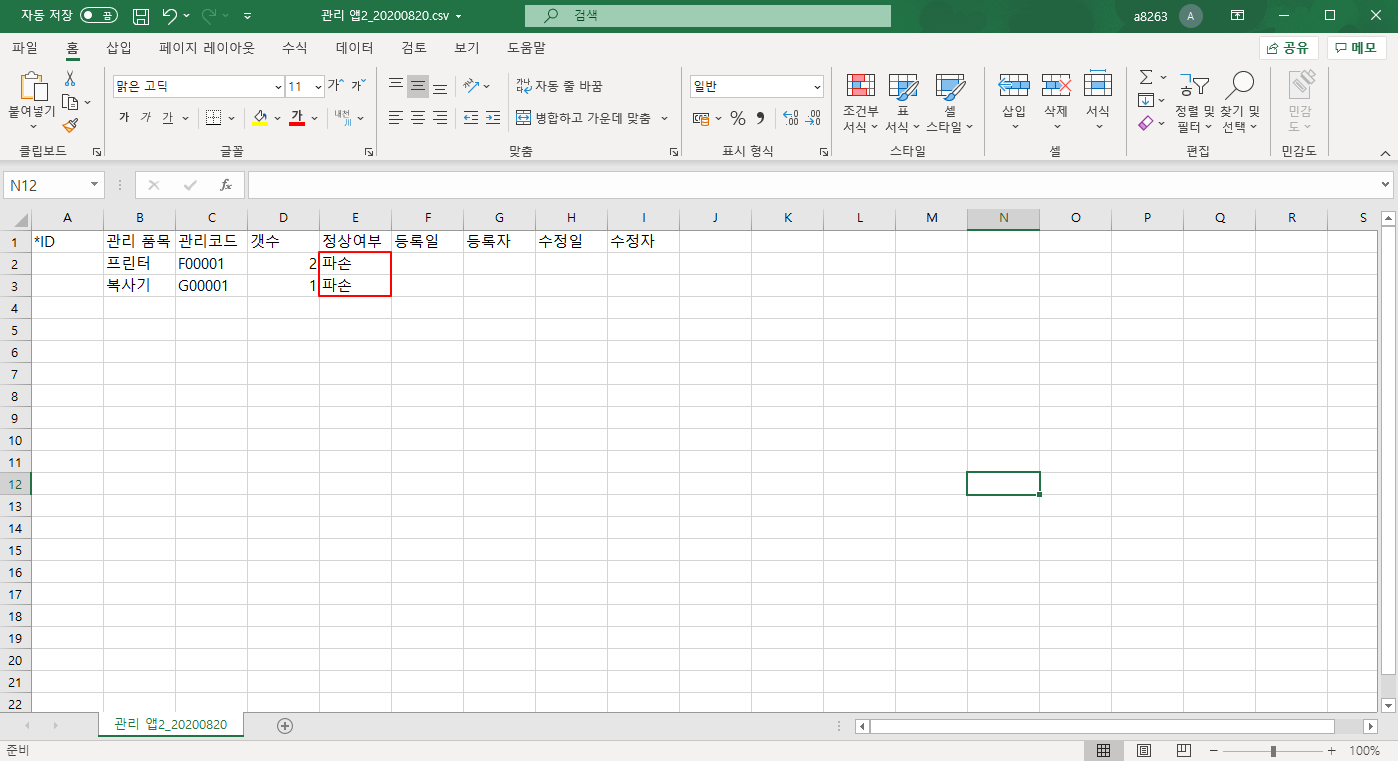 ⑥ csv 파일에서 유효성 오류 값 수정 ▷ 저장