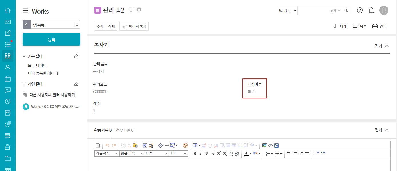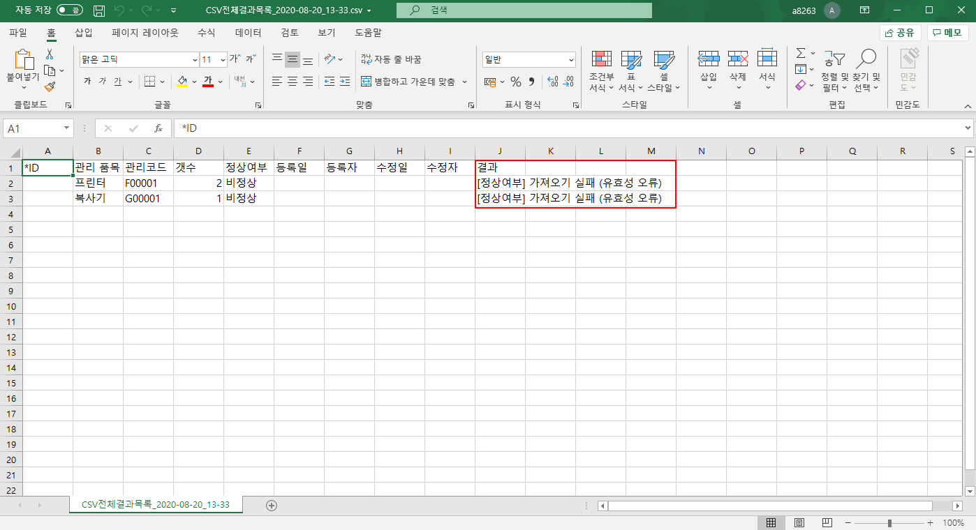 ② 결과 확인(예: 정상여부 항목-유효성 오류)