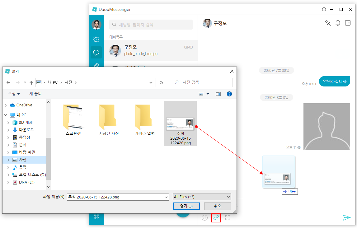 대화창으로 파일을 드래그하여 첨부할 수 있습니다.
