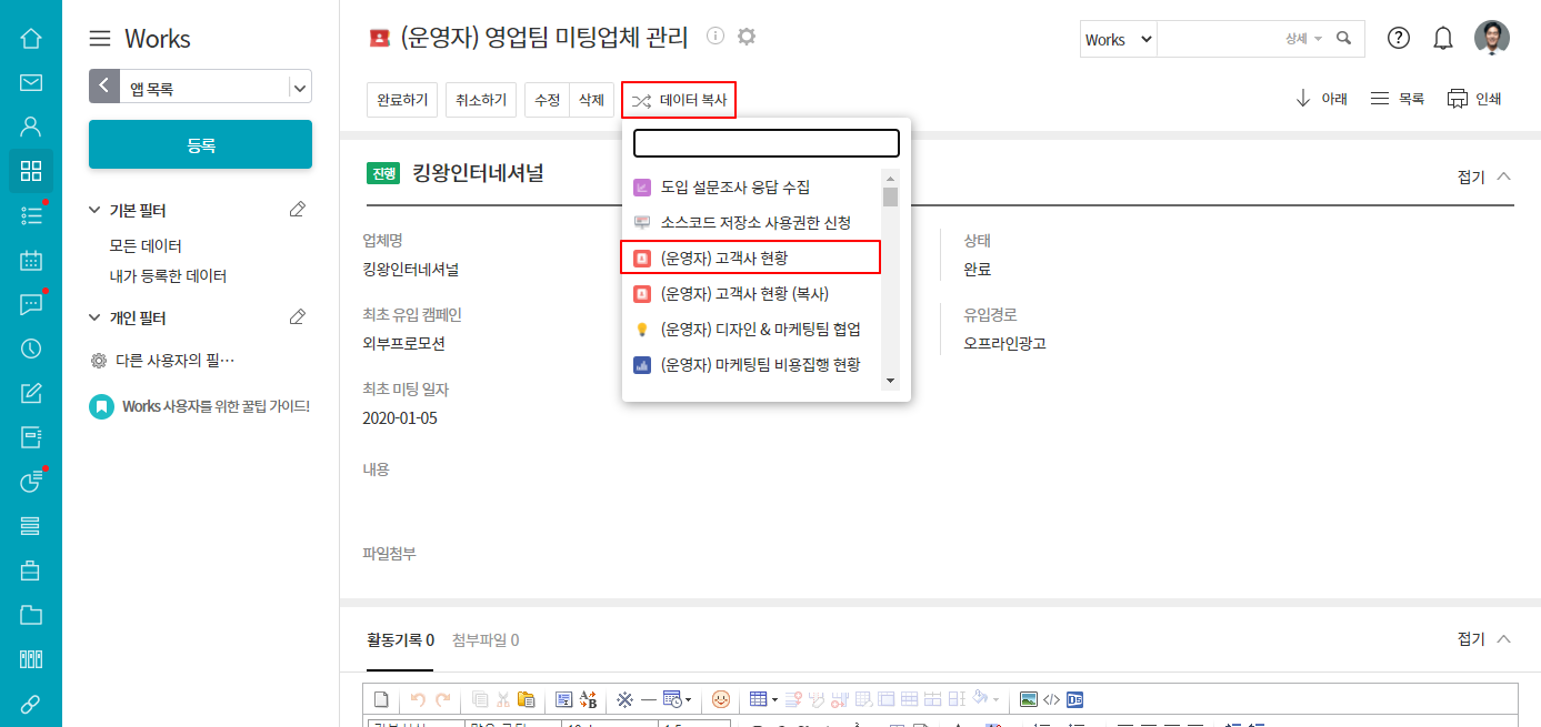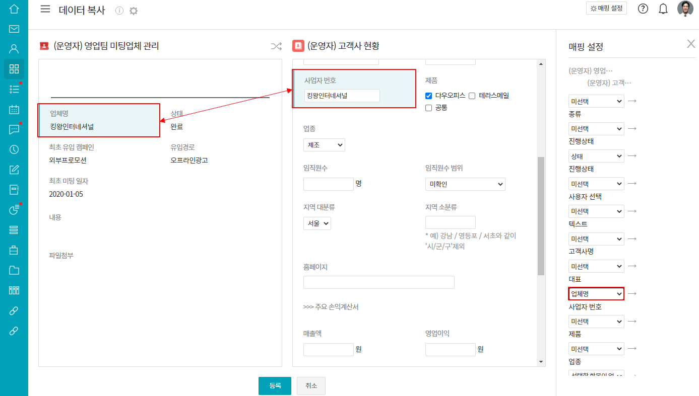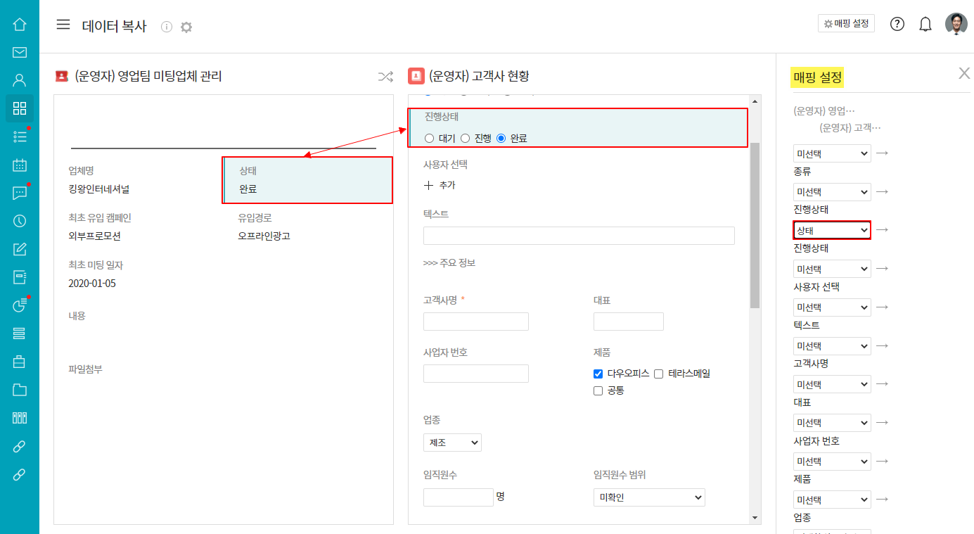 [데이터 복사] 기능으로 특정 항목에 대한 데이터를 매핑 및 복사할 수 있습니다.