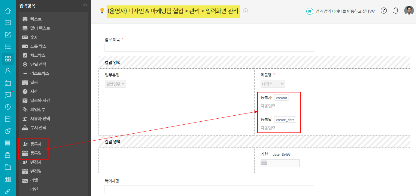앱 운영자 권한으로 입력화면 관리에서 자동 입력 항목인 [등록자], [등록일] 항목을 추가하시기 바랍니다.