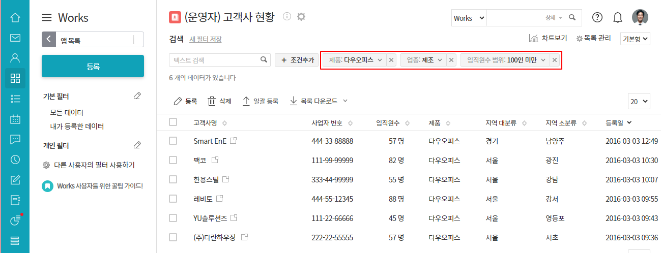 - Works ▶ 앱 클릭 ▶ + 조건추가 ▷ 조건 설정 ▷ 새 필터 저장 ▷ 필터명 입력 ▷ 확인