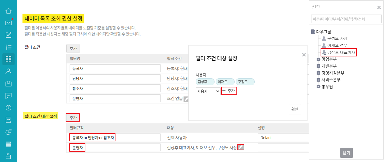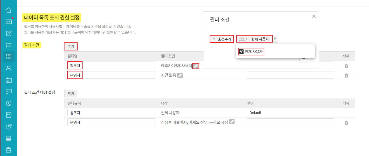 ② 데이터 목록 조회 권한 설정 시 필터 조건에 담당자, 참조자 등의 항목이 보이지 않습니다.