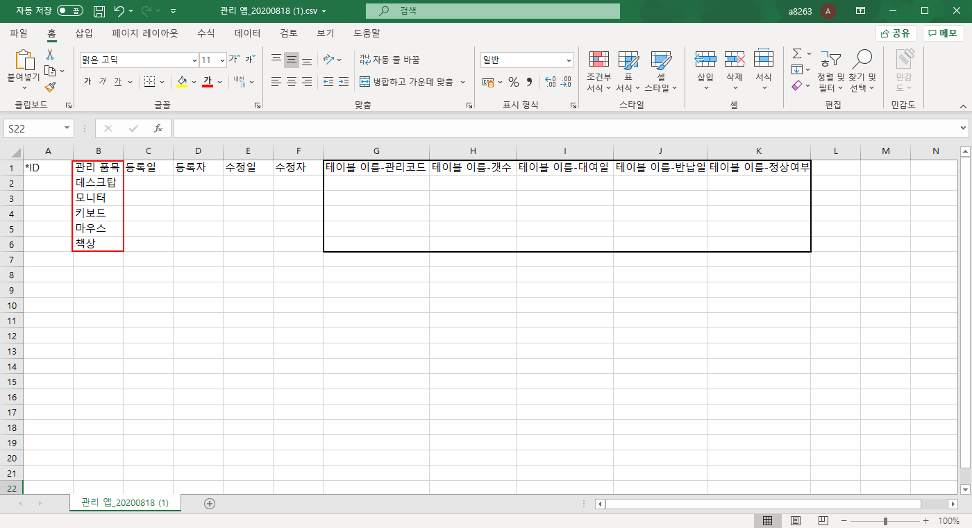 ② 테이블 영역을 제외한 항목들에 내용을 입력 후 csv파일로 저장