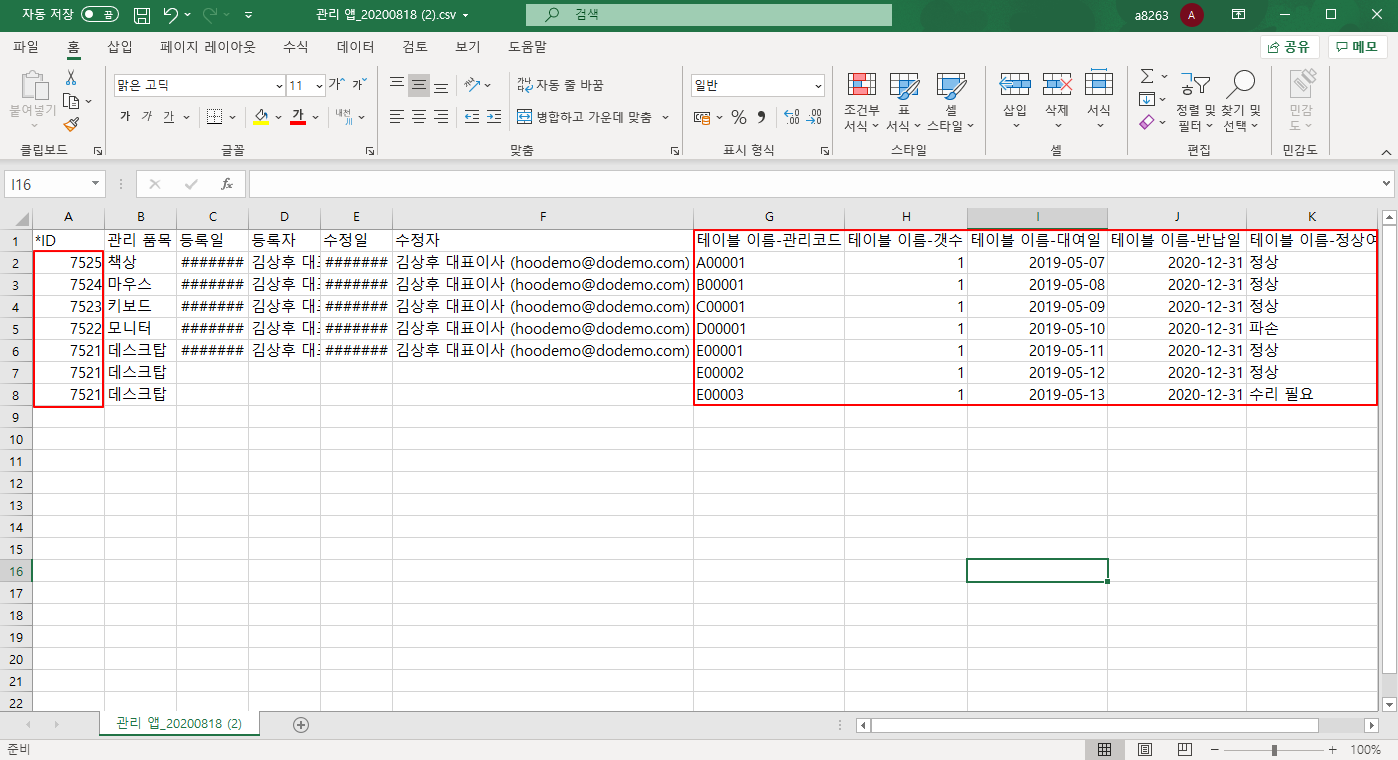 ⑥ ID가 부여된 등록된 데이터의 테이블 영역 내 내용 입력 및 csv파일 저장
