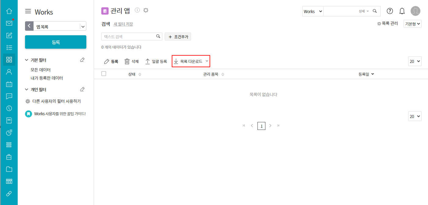 목록 다운로드를 진행하여 테이블 영역의 내용을 입력 후 일괄 등록할 수 있습니다.