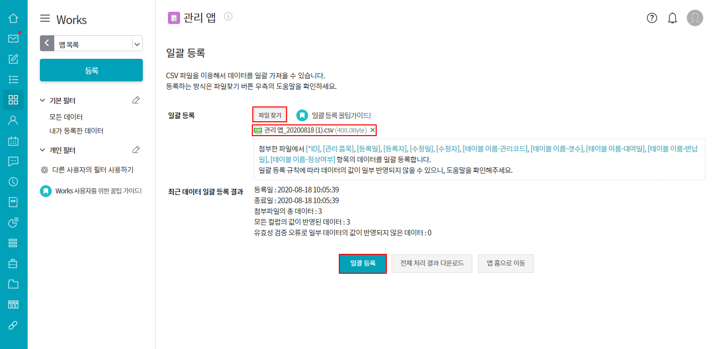 csv 파일을 통해 정해진 규칙으로 데이터를 일괄등록 할 수 있습니다.