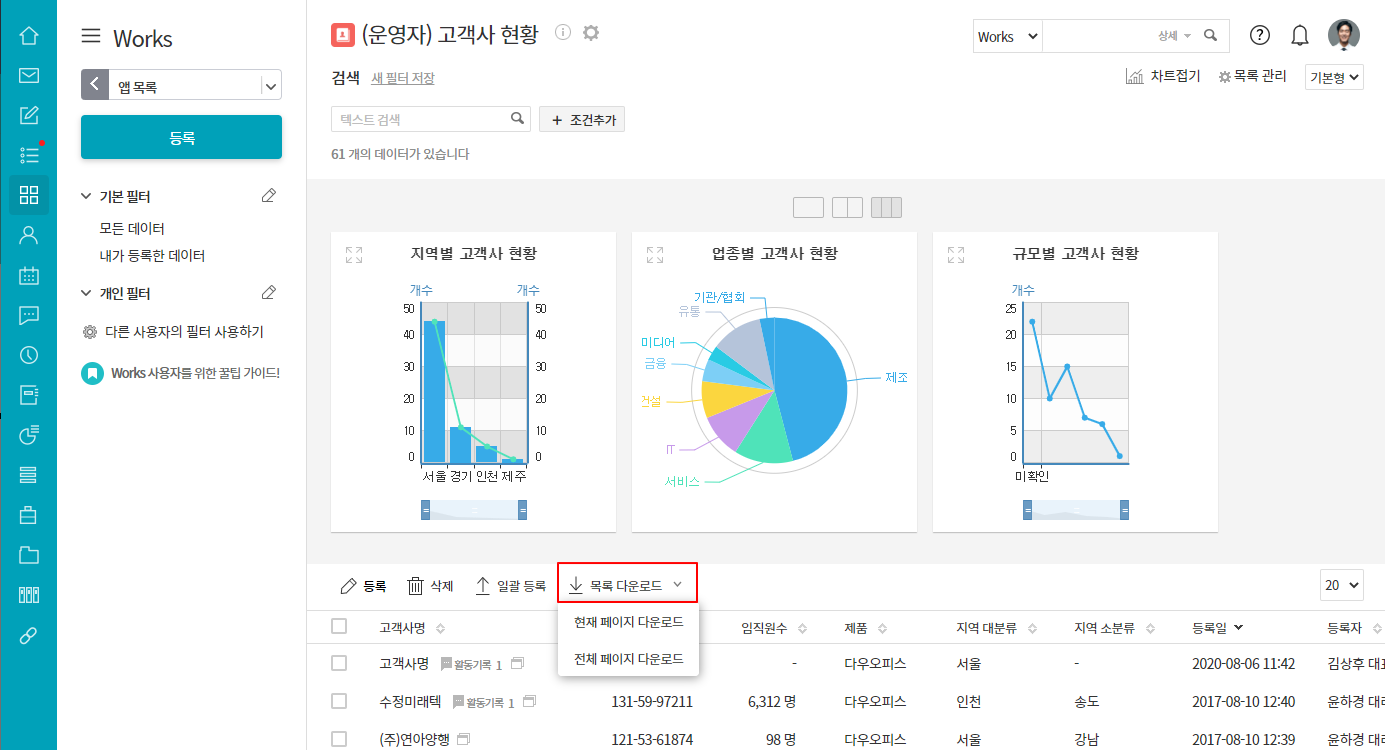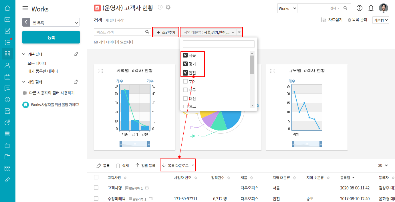 - 예) 고객사 현황 앱에서 서울, 경기, 인천에 있는 고객사의 데이터만 목록 다운로드 하고자 하는 경우.