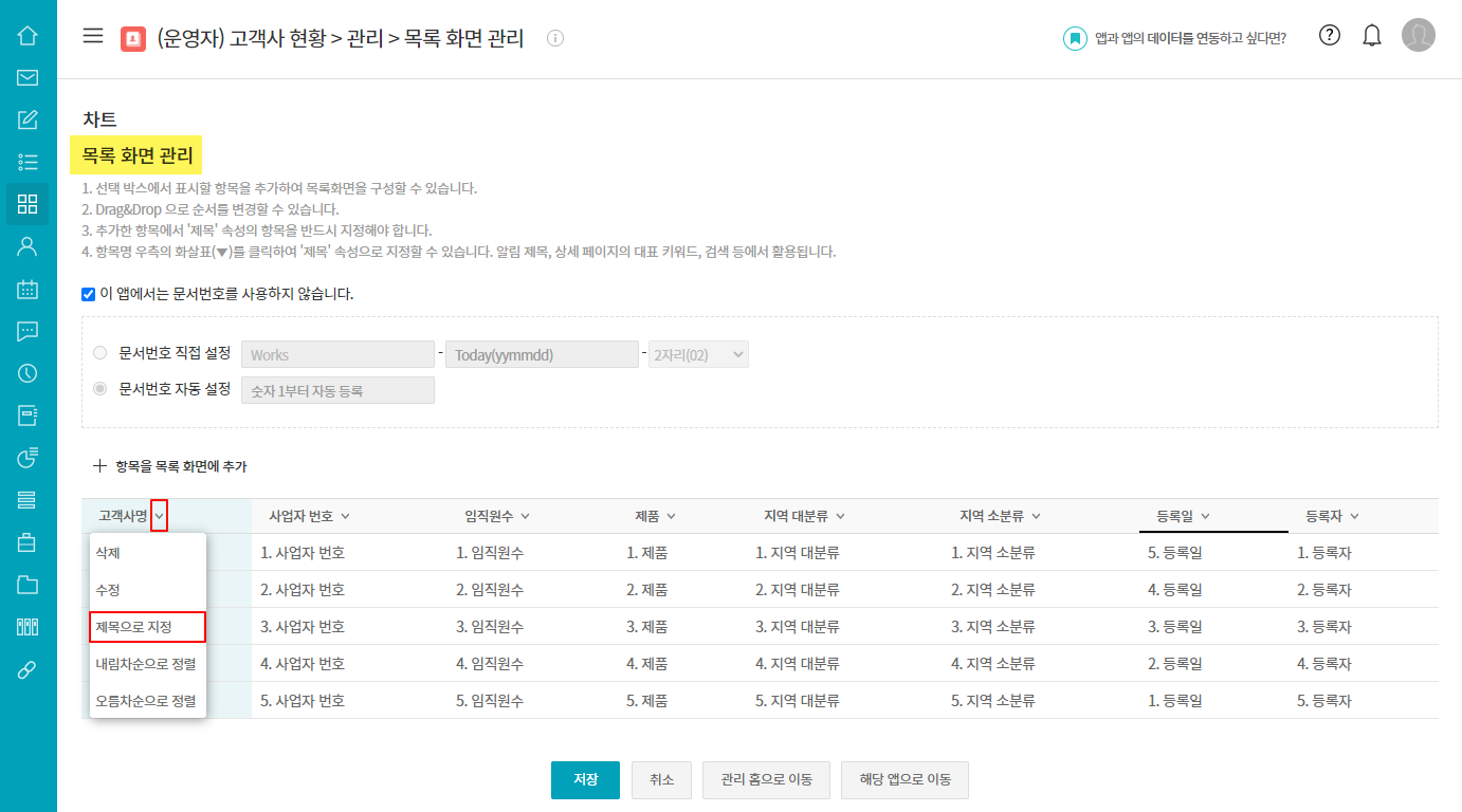 ※ 제목으로 지정된 항목은 목록화면 관리에서 하늘색으로 표시됩니다.