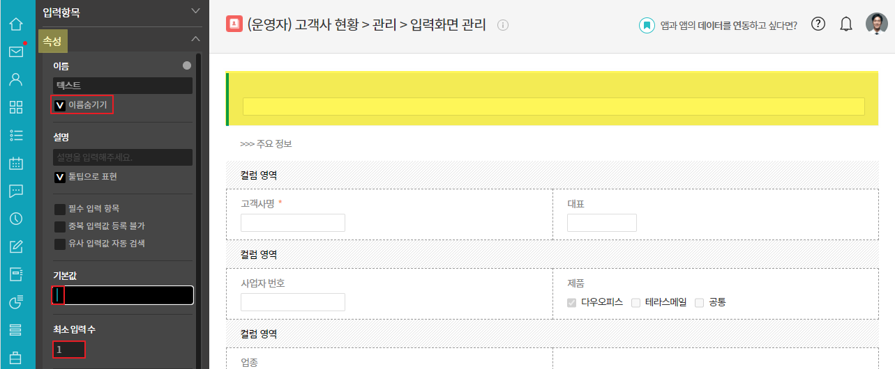 앱의 운영자가 텍스트 항목 추가 후 공란을 기본값으로 설정 및 제목으로 지정 시 공란으로 보여집니다.