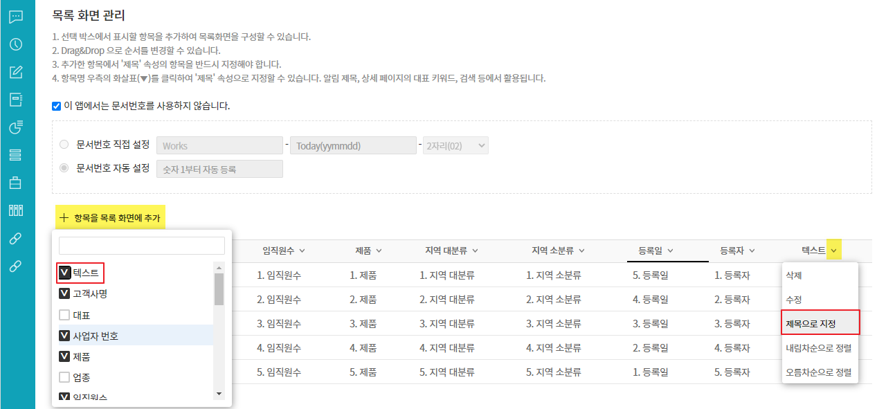 ③ 앱 관리 ▶ 목록 화면 ▶ 항목을 목록 화면에 추가 ▷ 텍스트 체크 ▷ 텍스트 옆 v ▷ 제목으로 지정 ▷ 저장