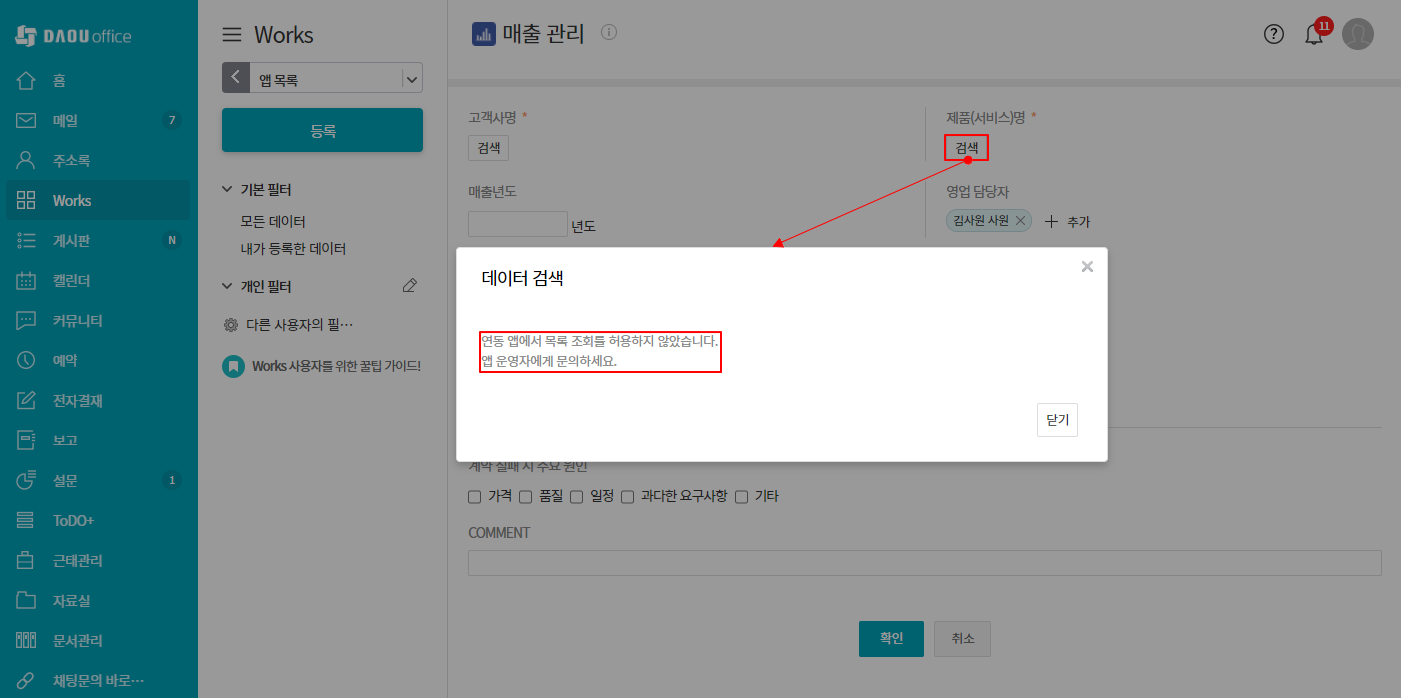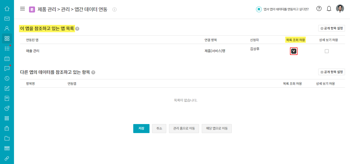 예) 매출 관리 앱에서 데이터 등록 시, 제품 관리 앱과 연동한 항목에서