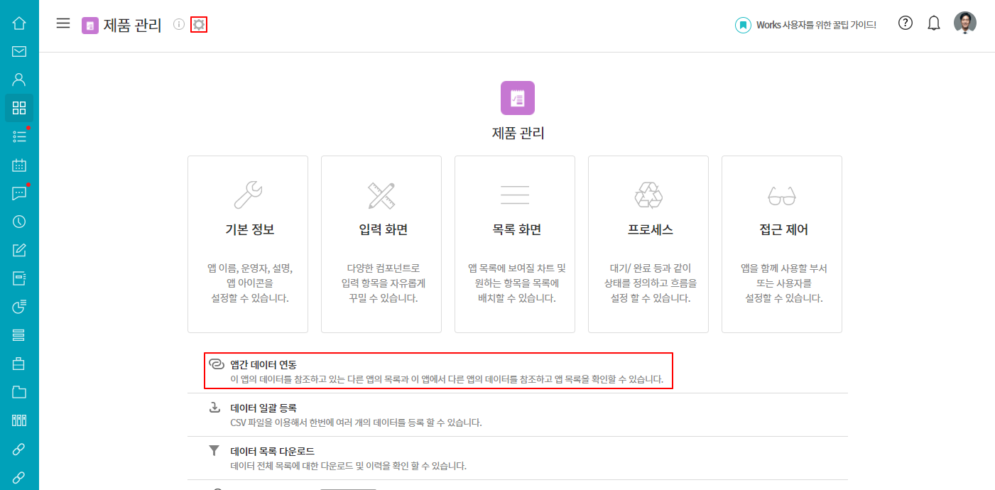 ① 제품 관리 앱 관리 ▶ 앱간 데이터 연동
