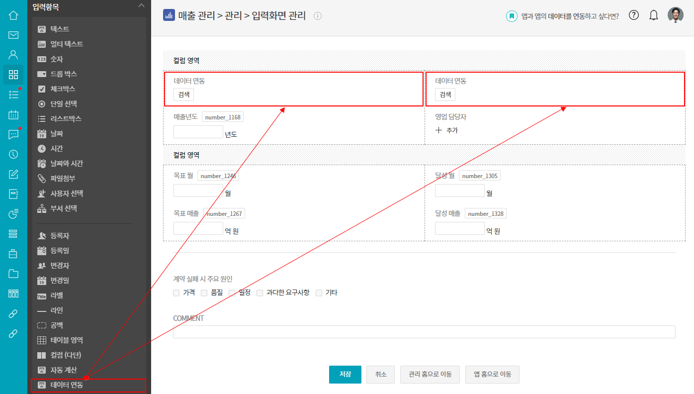 ② 입력화면 관리 ▷ [데이터 연동] 항목 삽입