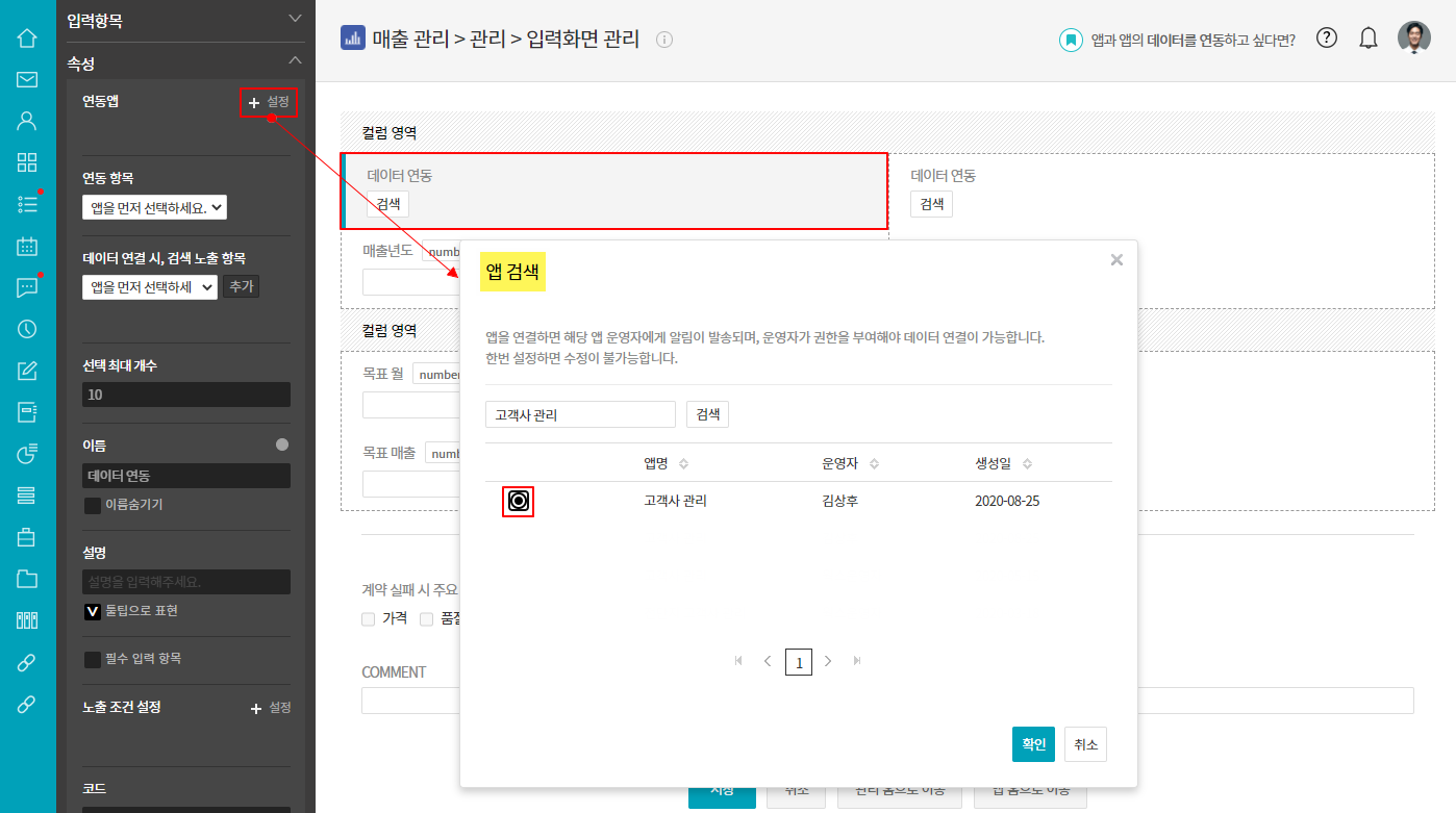 ③ 추가한 [데이터 연동] 항목 클릭 ▷ 연동앱 ▷ + 설정 ▷ 앱 검색 ▷ '고객사 관리'앱 선택 ▷ 확인